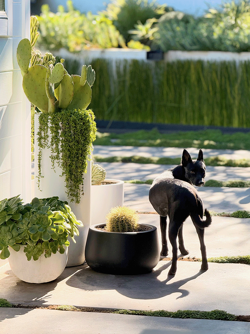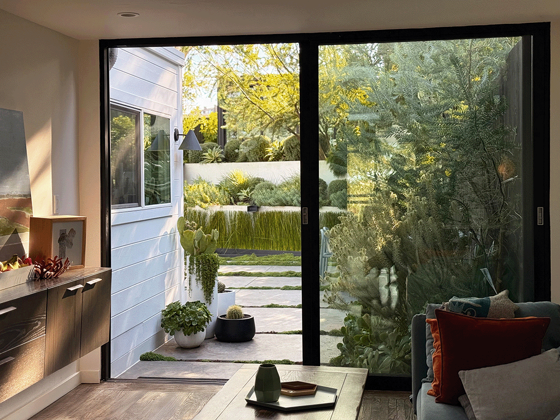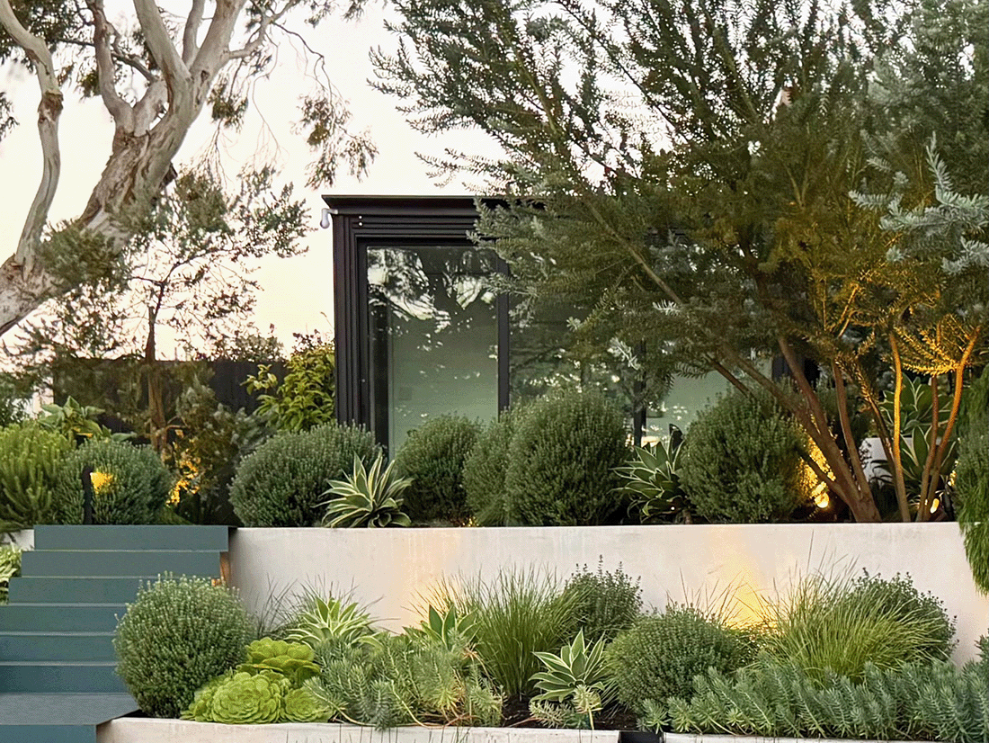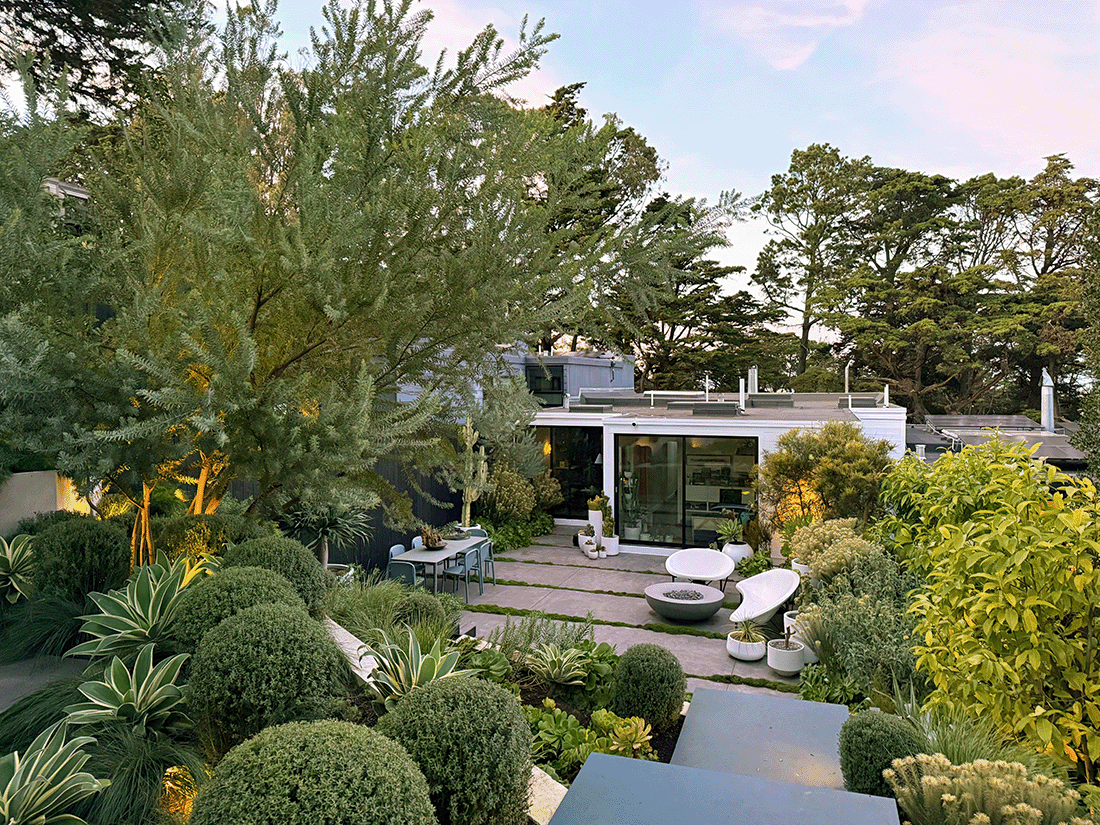 This elevated San Francisco garden provides a generous level-out entertainment and play space just out the back doors. The angled retaining walls create a dynamic invitation to explore further into the garden. At the top of the floating metal stairs is an office that doubles as a restful getaway from the bustle of the main house. The foliage forward plantings can tolerate the brisk winds and fog that flow over the hilltop. Heated furniture and a firepit provide a warm space to relax on cool evenings.
